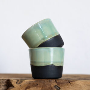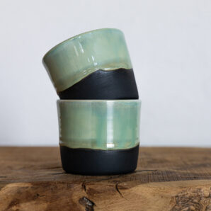 Becher schwarz mit einer grünlichen Glasur mit Farbverlauf.