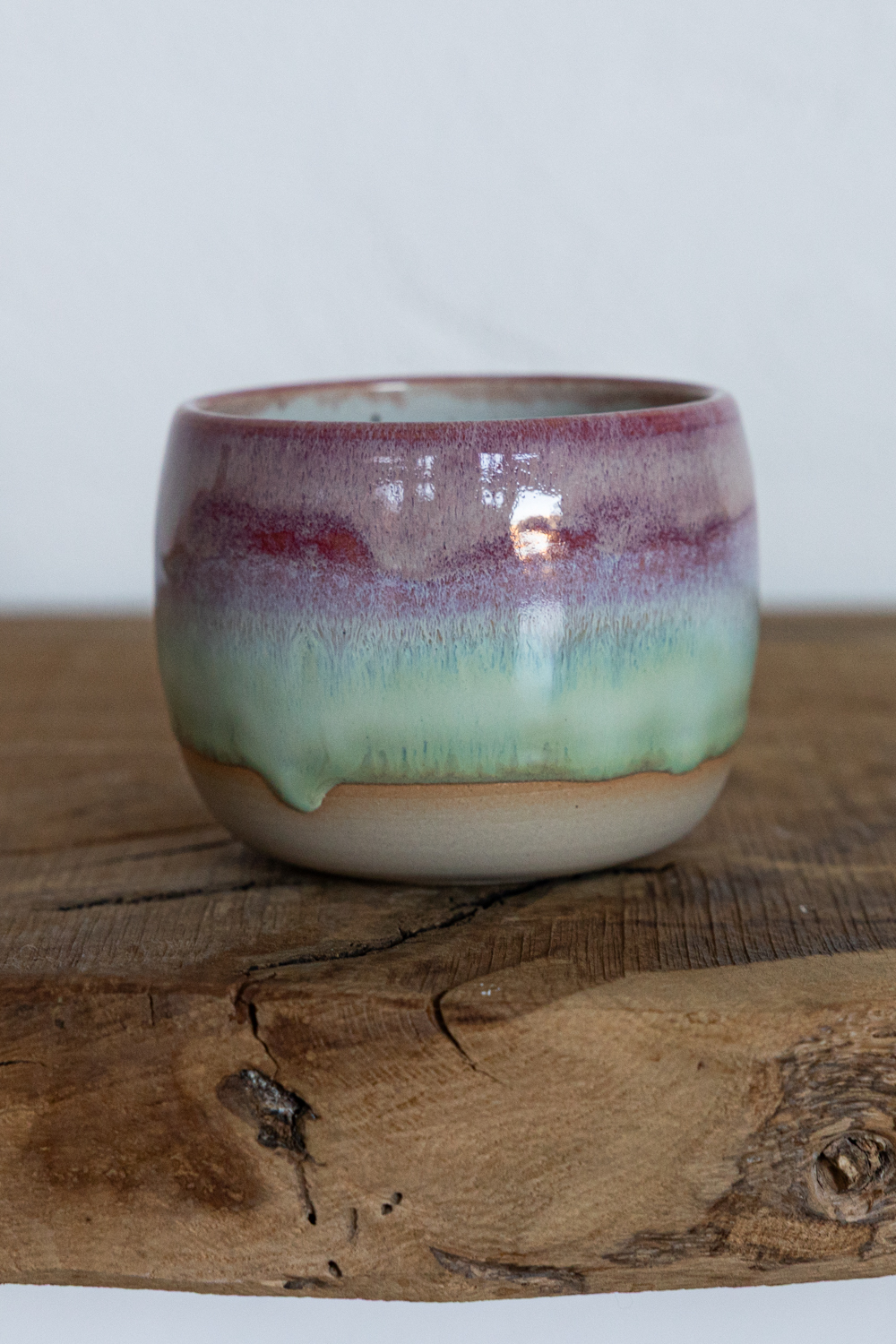 Becher mit einer rosa-grünen Glasur mit Farbverlauf.