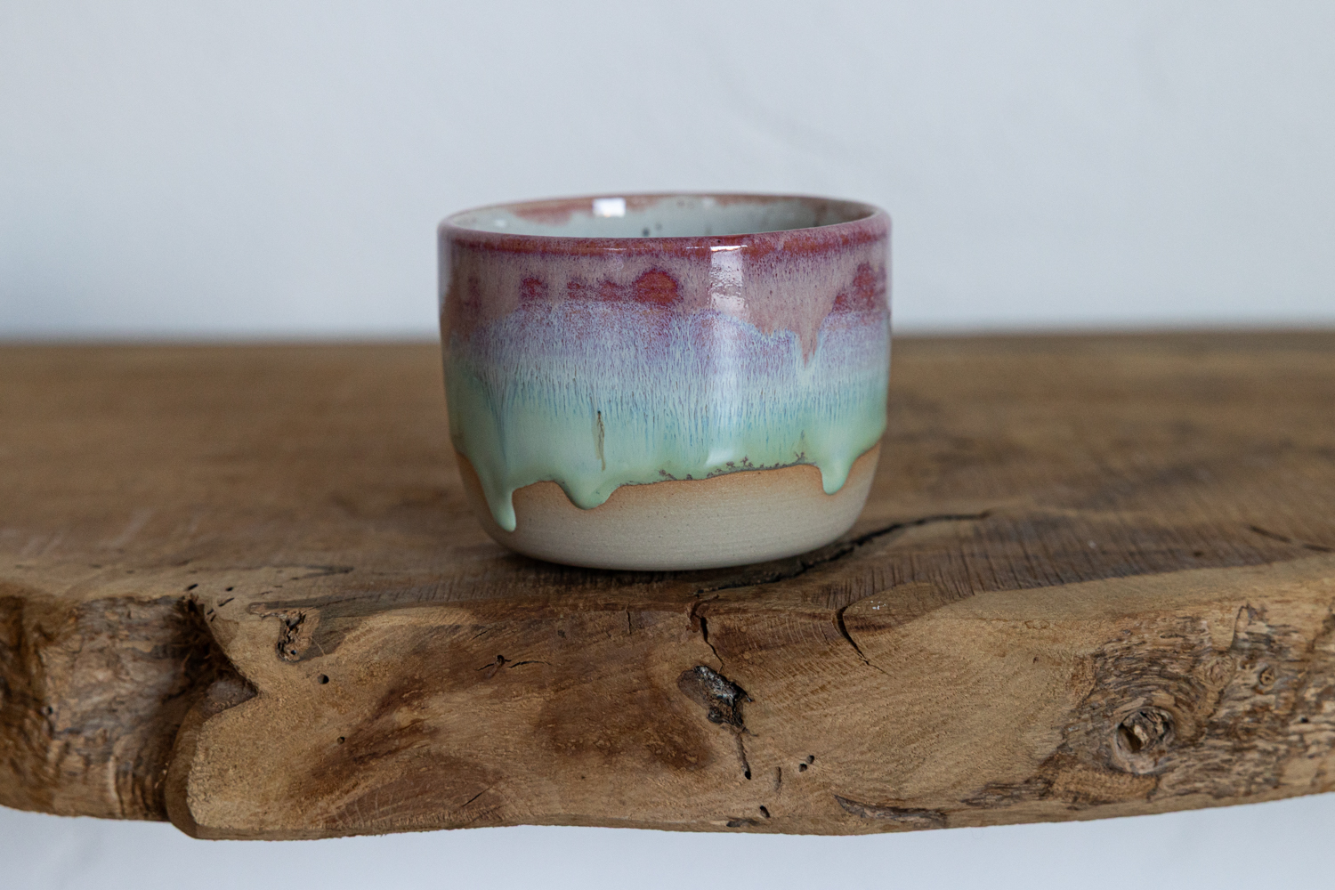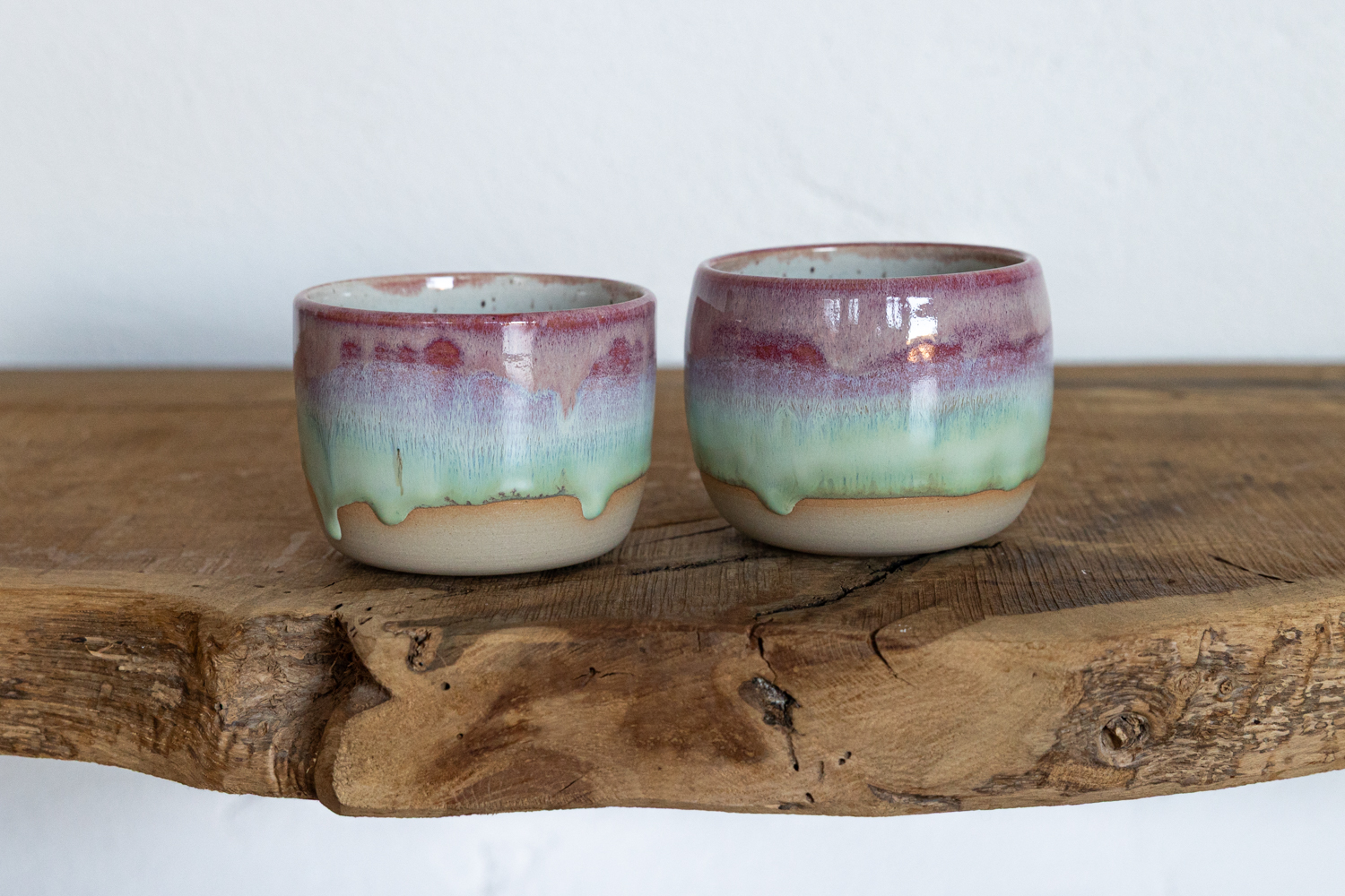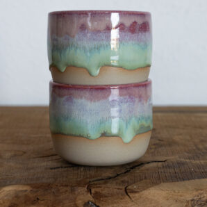 Becher mit einer rosa-grünen Glasur mit Farbverlauf.