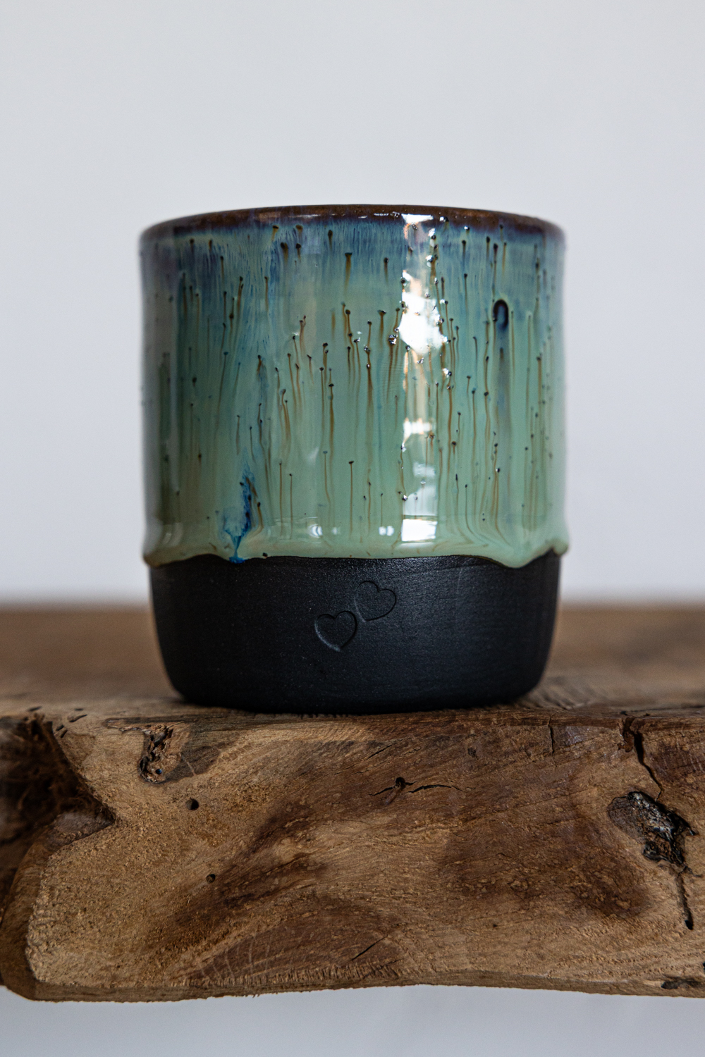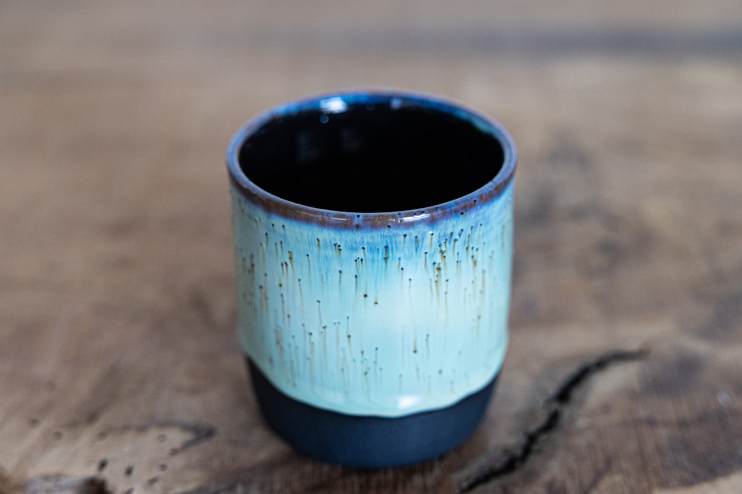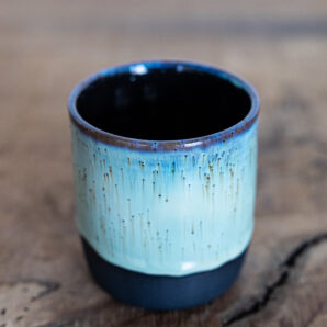 Im unteren Teil ist der Becher mit einer Engobe bemalt, darüber und innen glasiert.