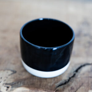 In der unteren Hälfte ist der Becher unglasiert, darüber und innen glasiert.