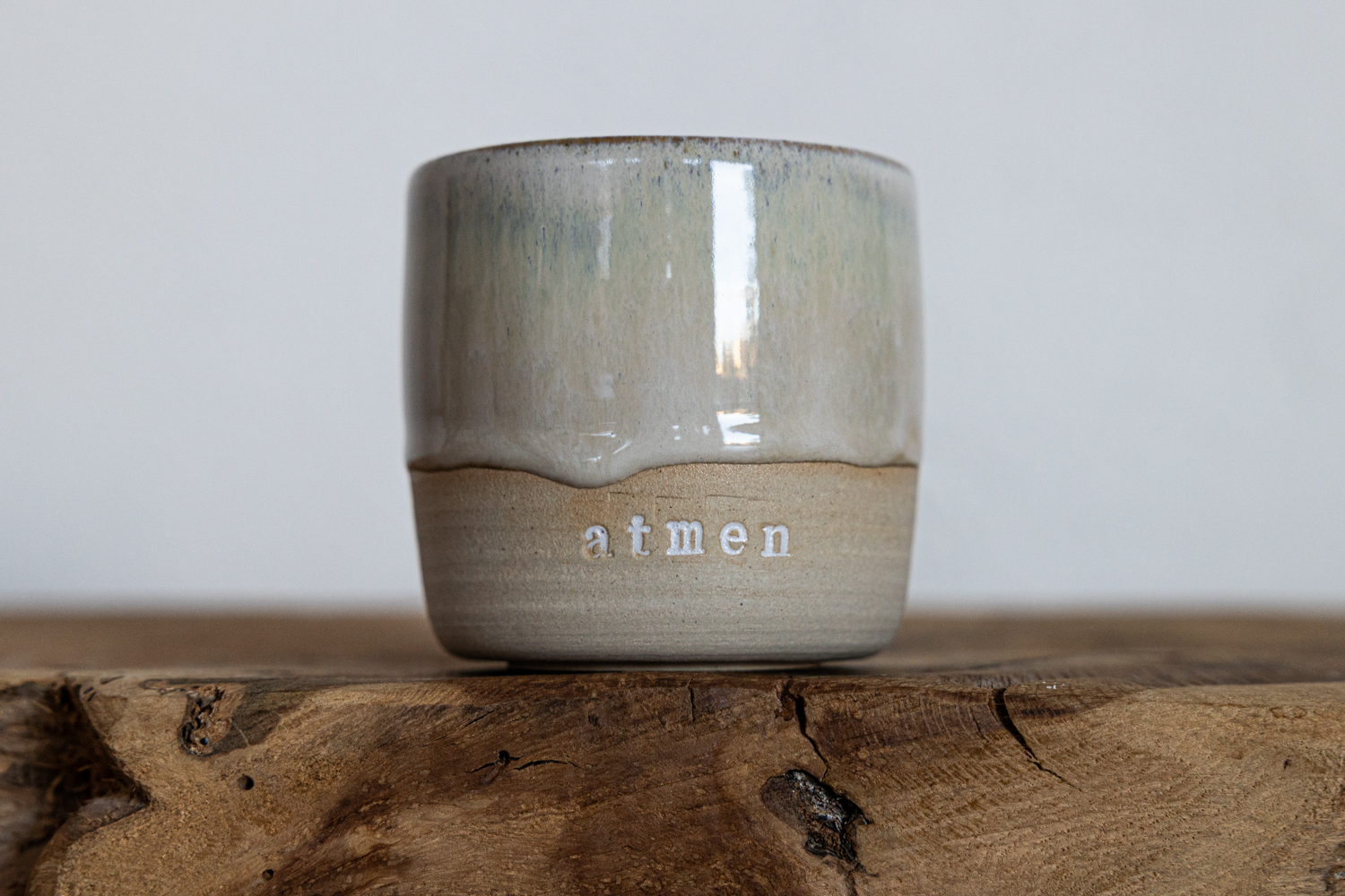 Mantrabecher „atmen“ in hellem Ton und einer beigen Glasur mit Farbverlauf.