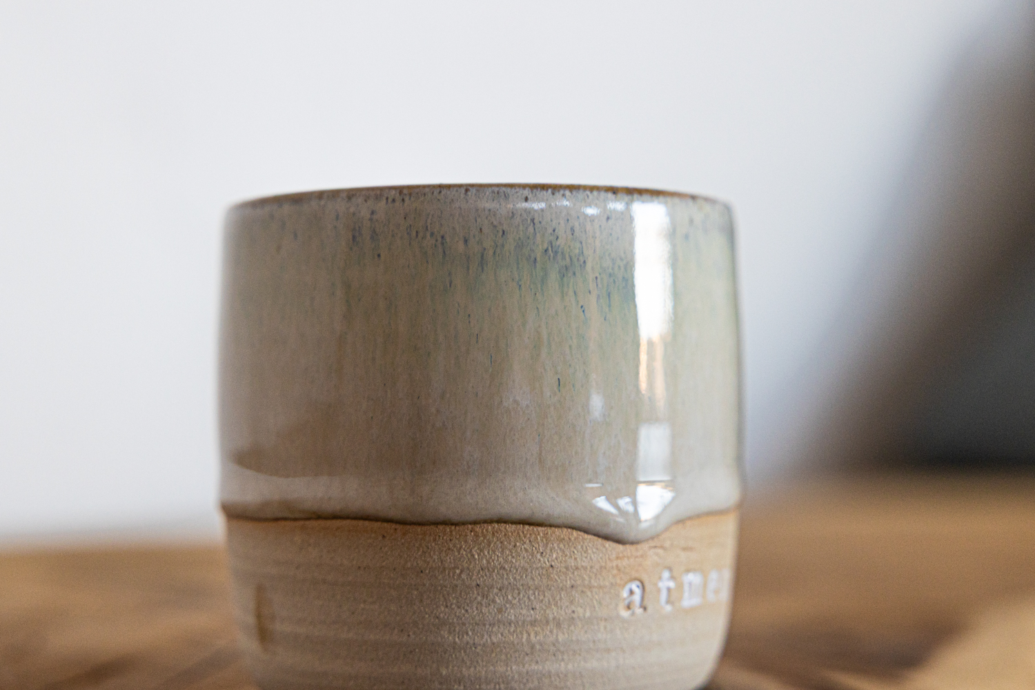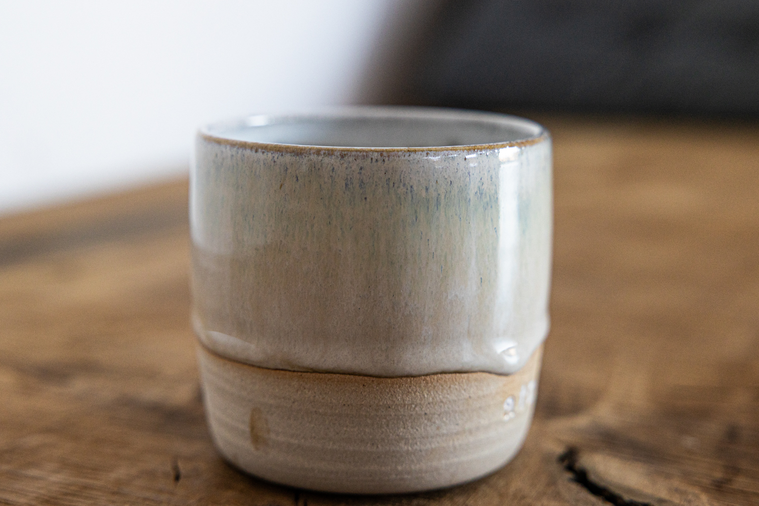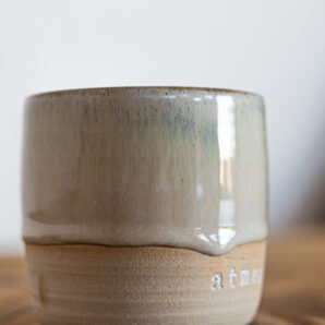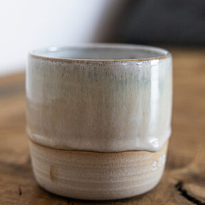 Im unteren Drittel ist der Becher unglasiert, darüber und innen mit einer hellblau-beigen Glasur versehen.