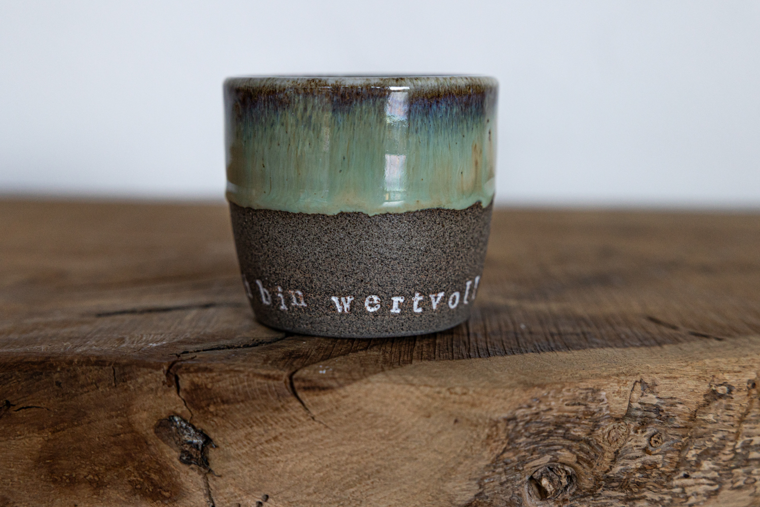 Mantrabecher „Ich bin wertvoll“ in grauem Ton und einer grünlichen Glasur mit Farbverlauf.