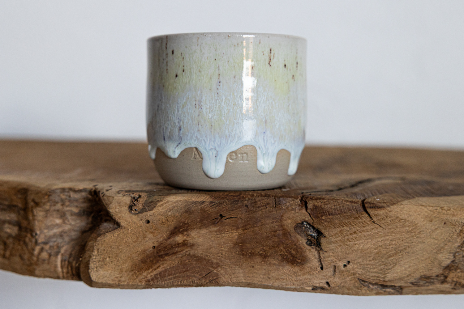 Im unteren Drittel ist der Becher unglasiert, darüber und innen mit einer hellen Glasur versehen.