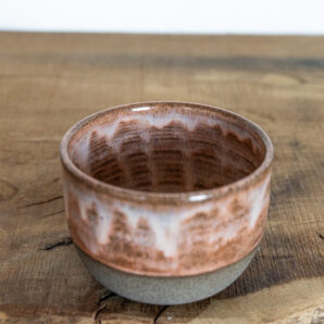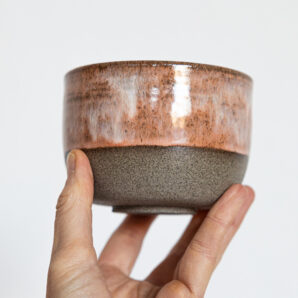 Teeschale grau mit einer pfirsich-weißen Glasur.