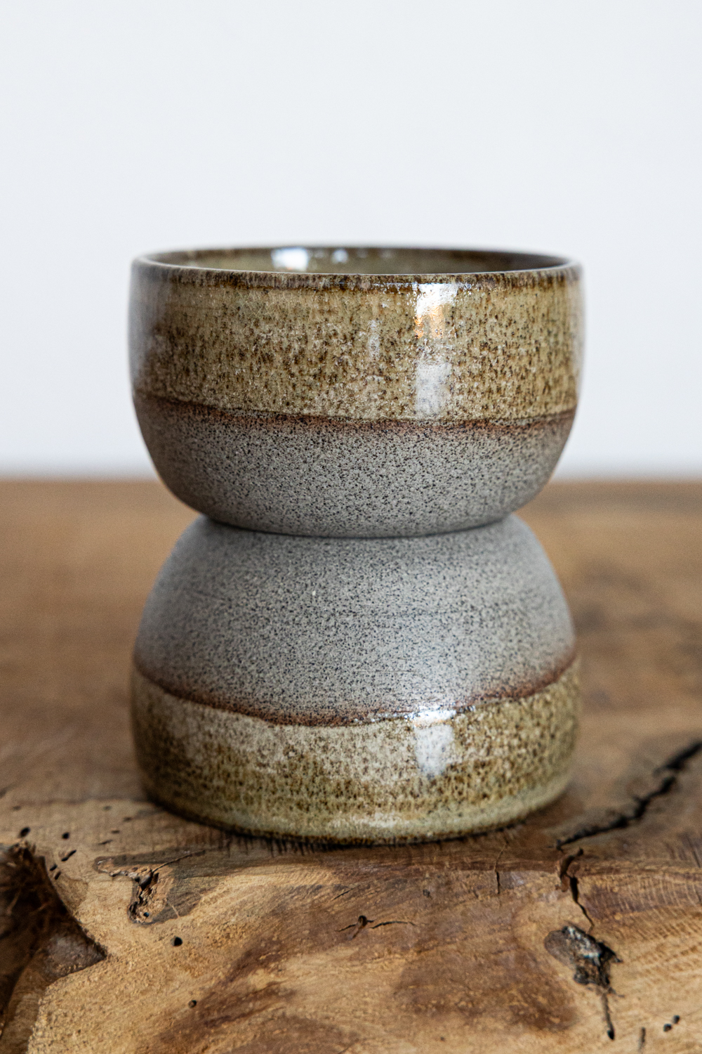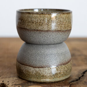 In der unteren Hälfte ist der Becher unglasiert, darüber und innen glasiert.