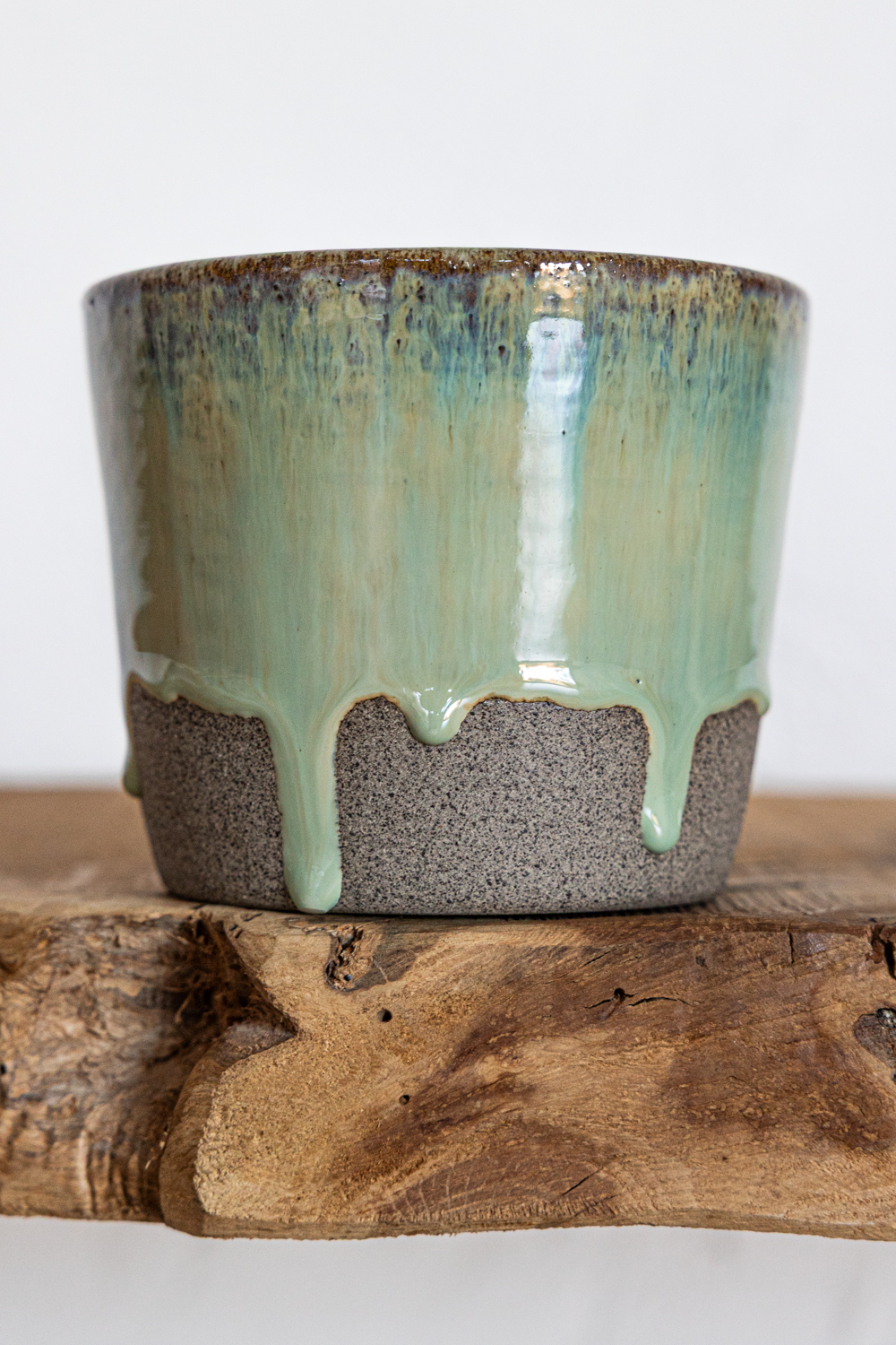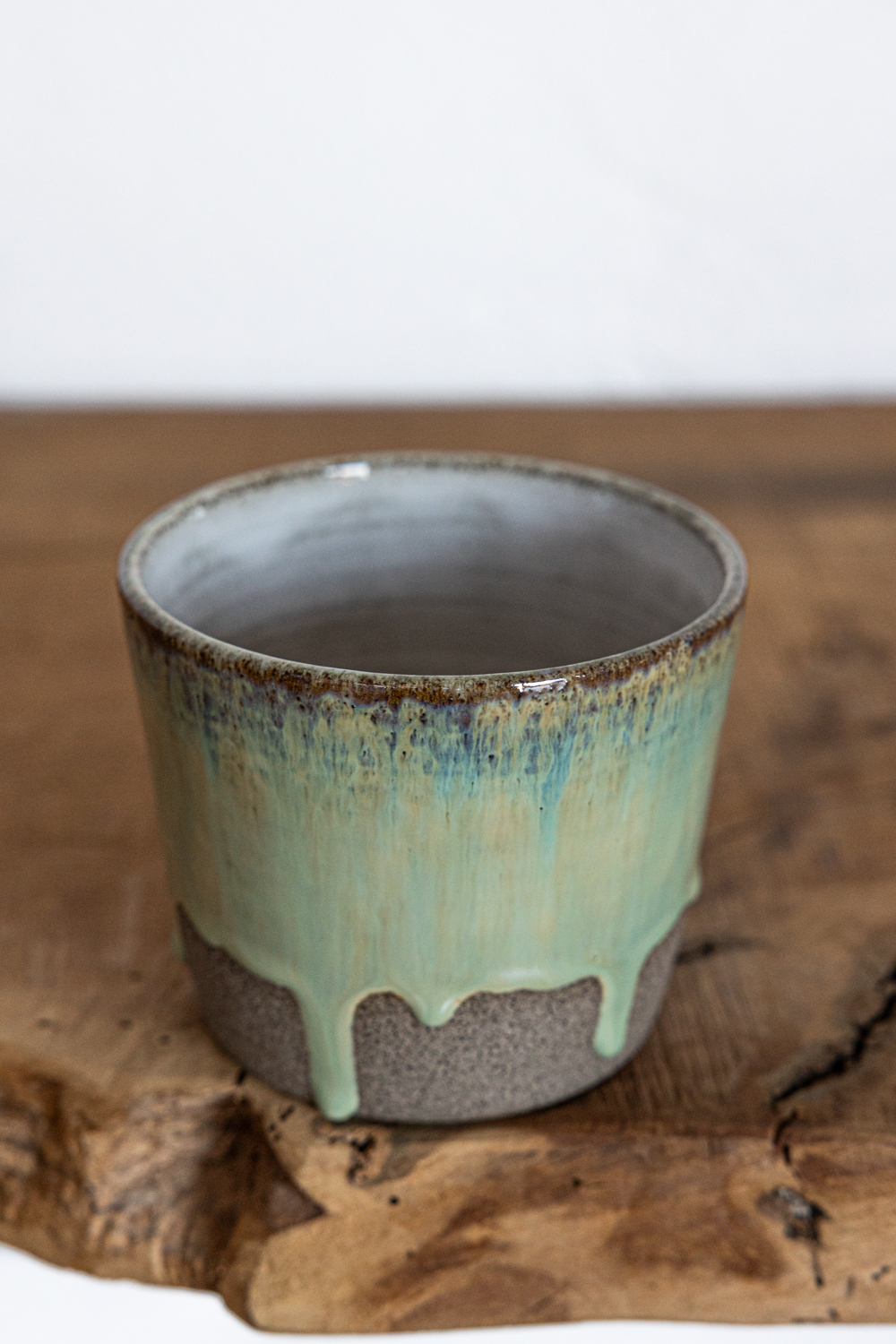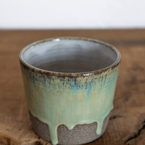 Im unteren Drittel ist der Becher unglasiert, darüber und innen glasiert.