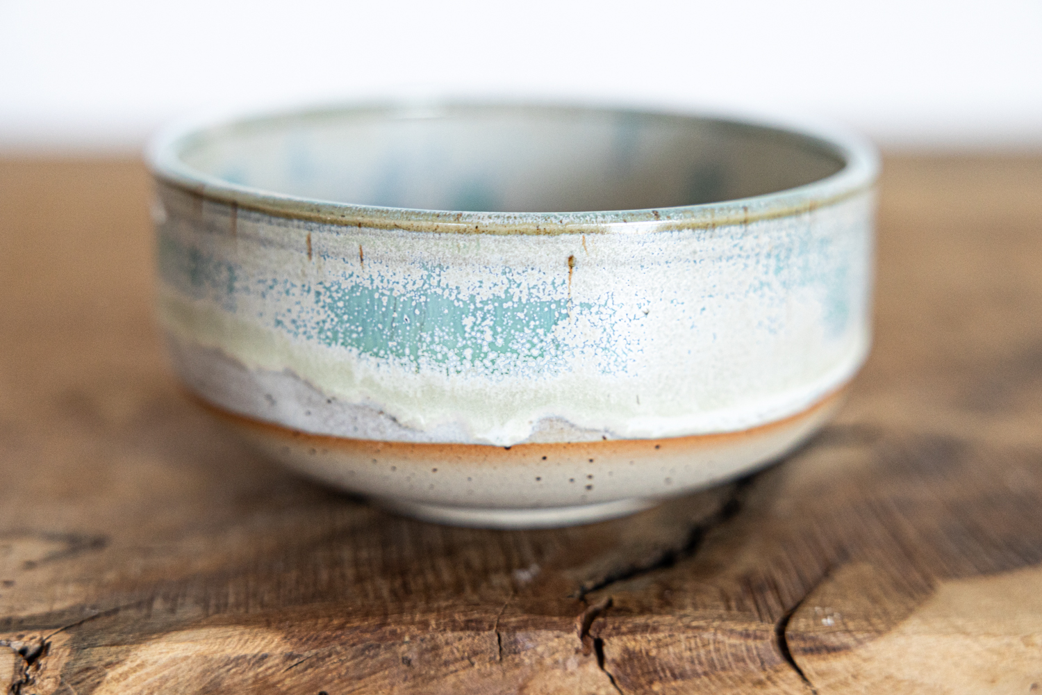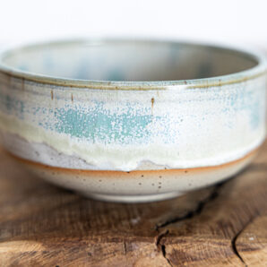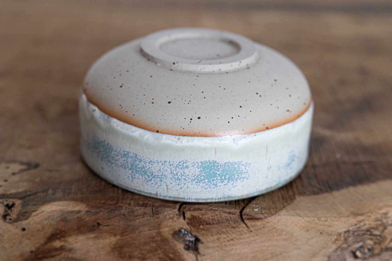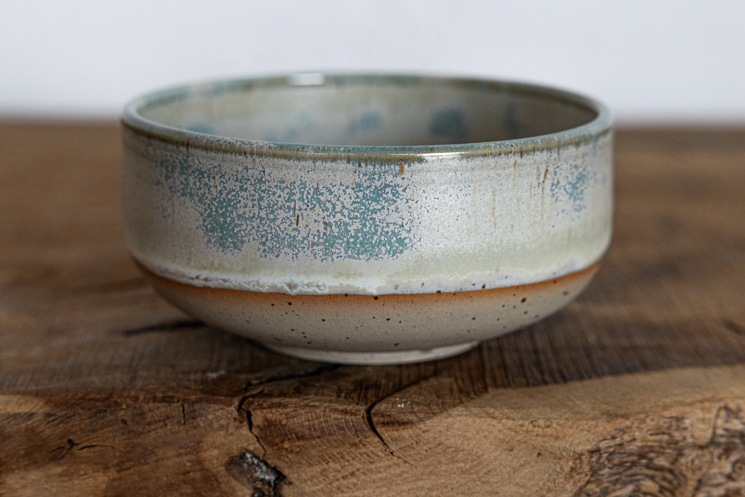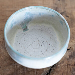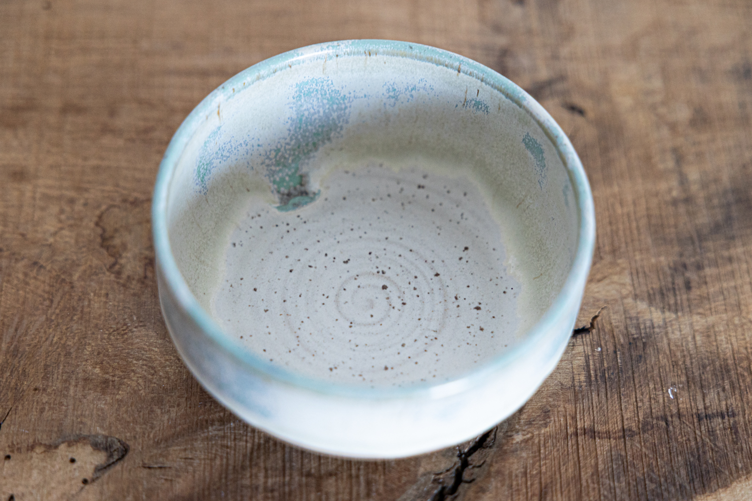 Matcha Schale hell mit einer grün-blau-cremefarbenen Glasur mit Farbverlauf.