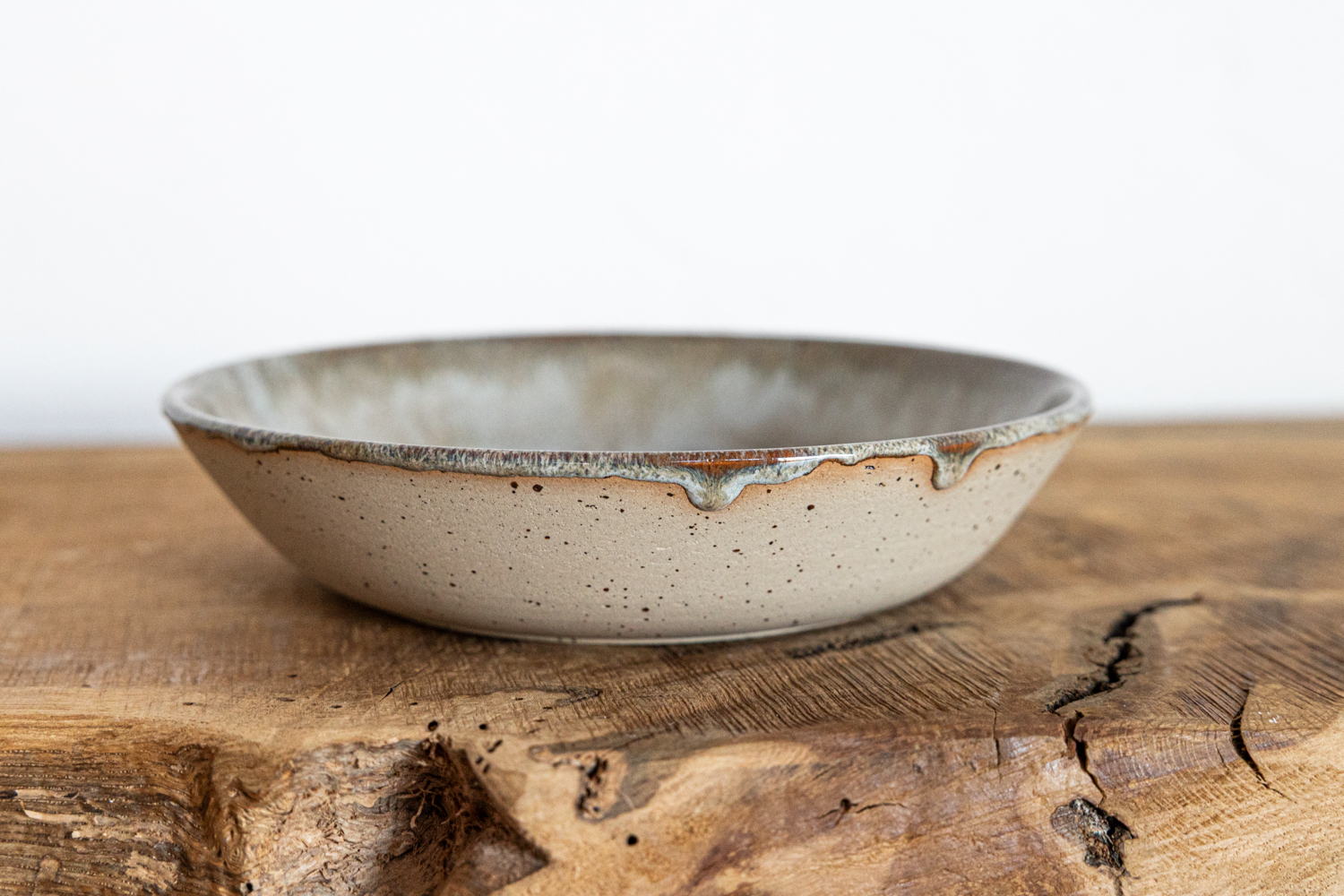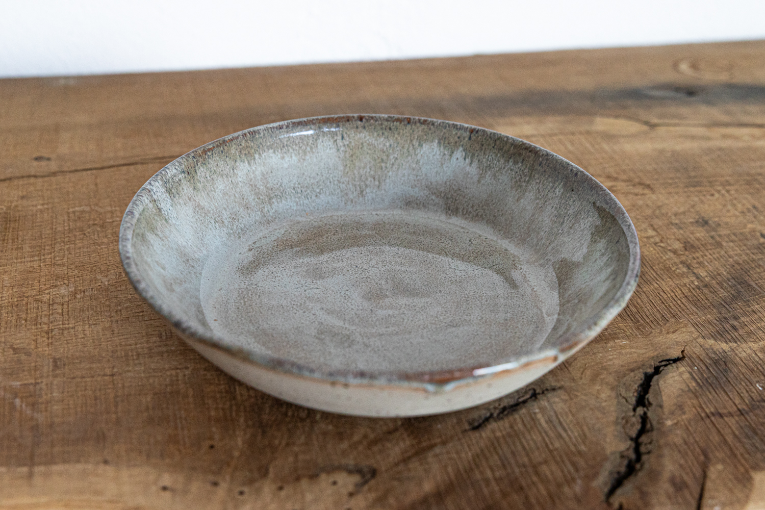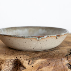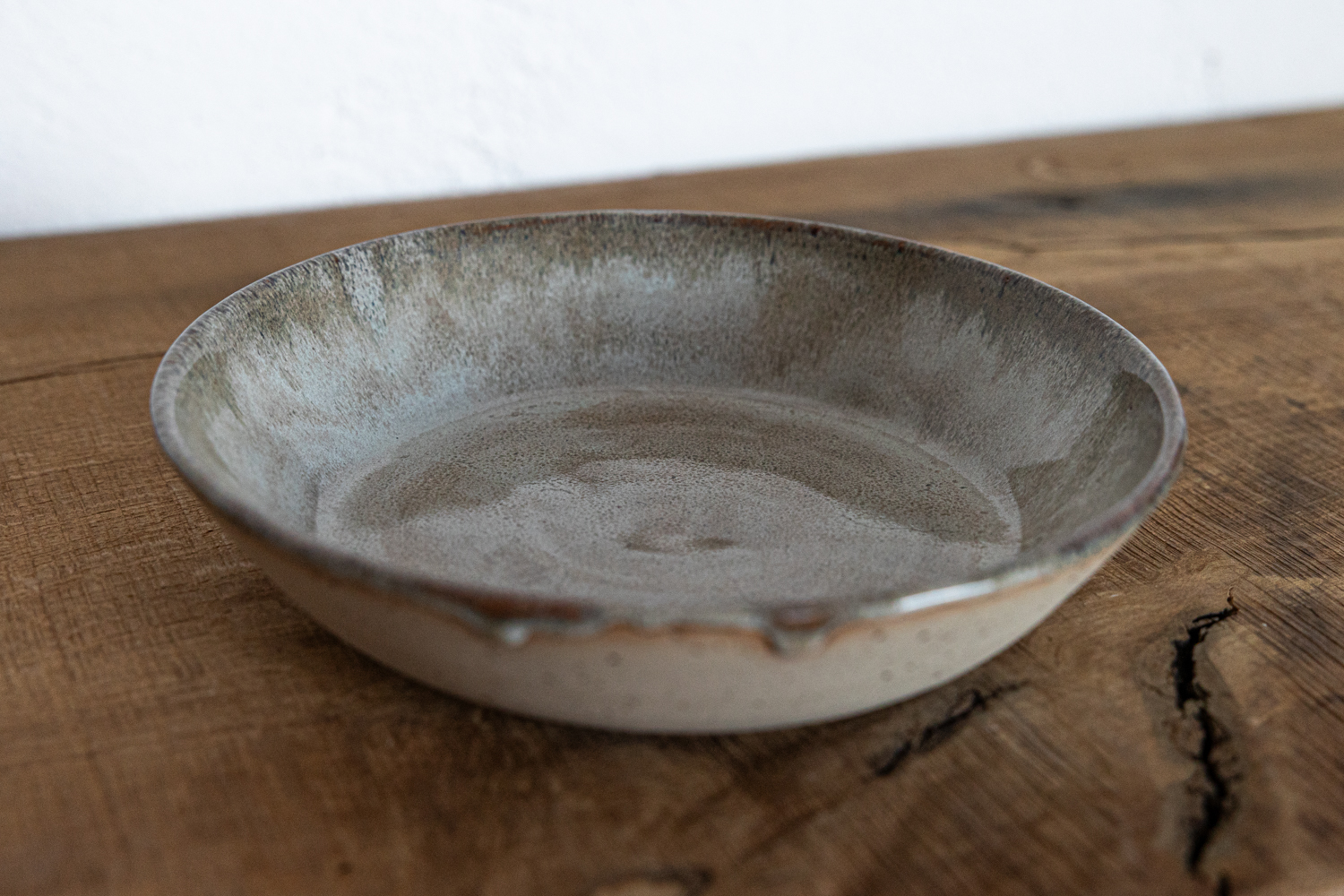 Tiefer teller oder Schale hell mit Punkten und einer Glasur mit Farbverlauf.