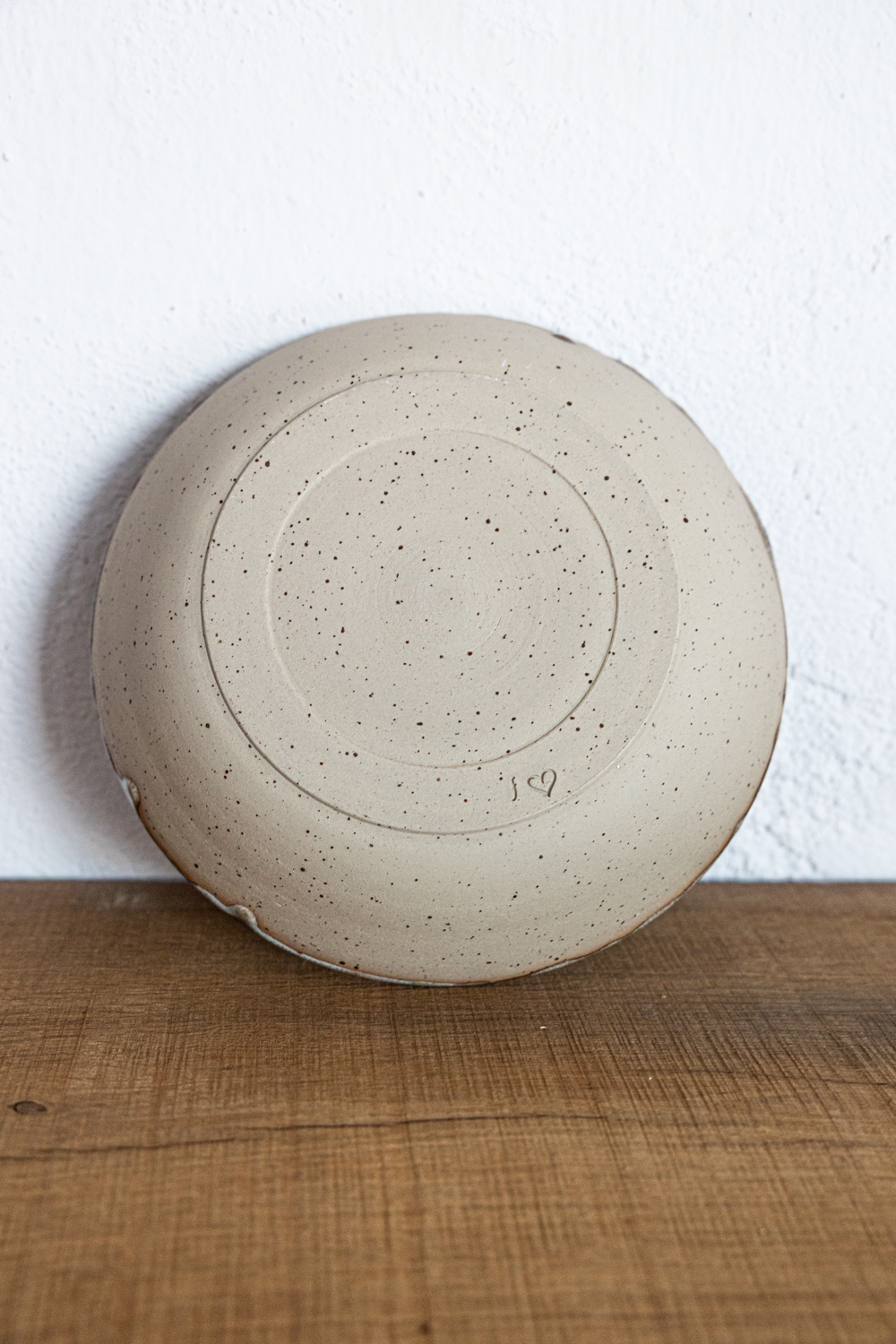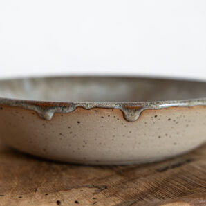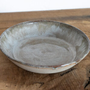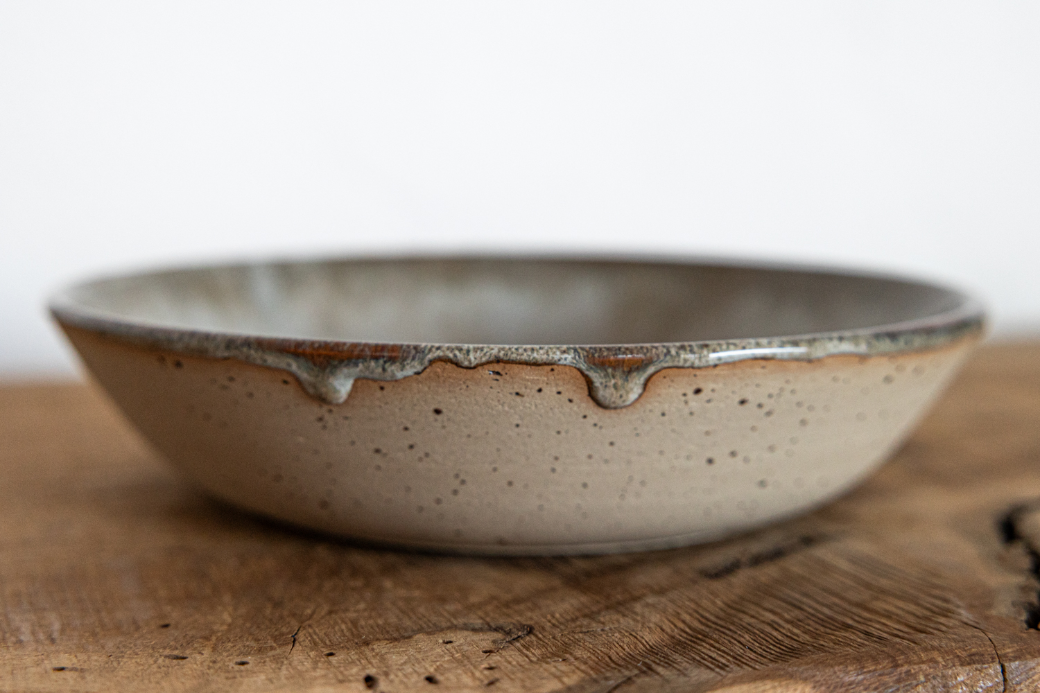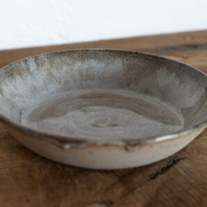 Tiefer teller oder Schale hell mit Punkten und einer Glasur mit Farbverlauf.