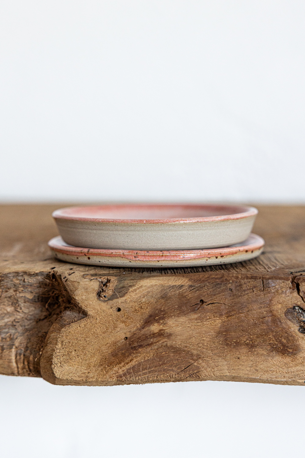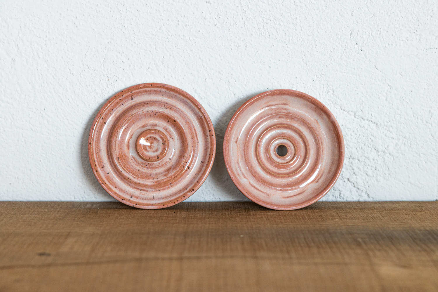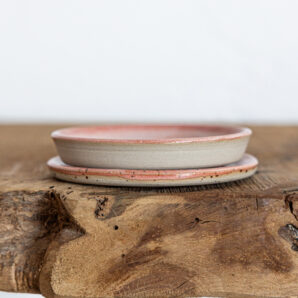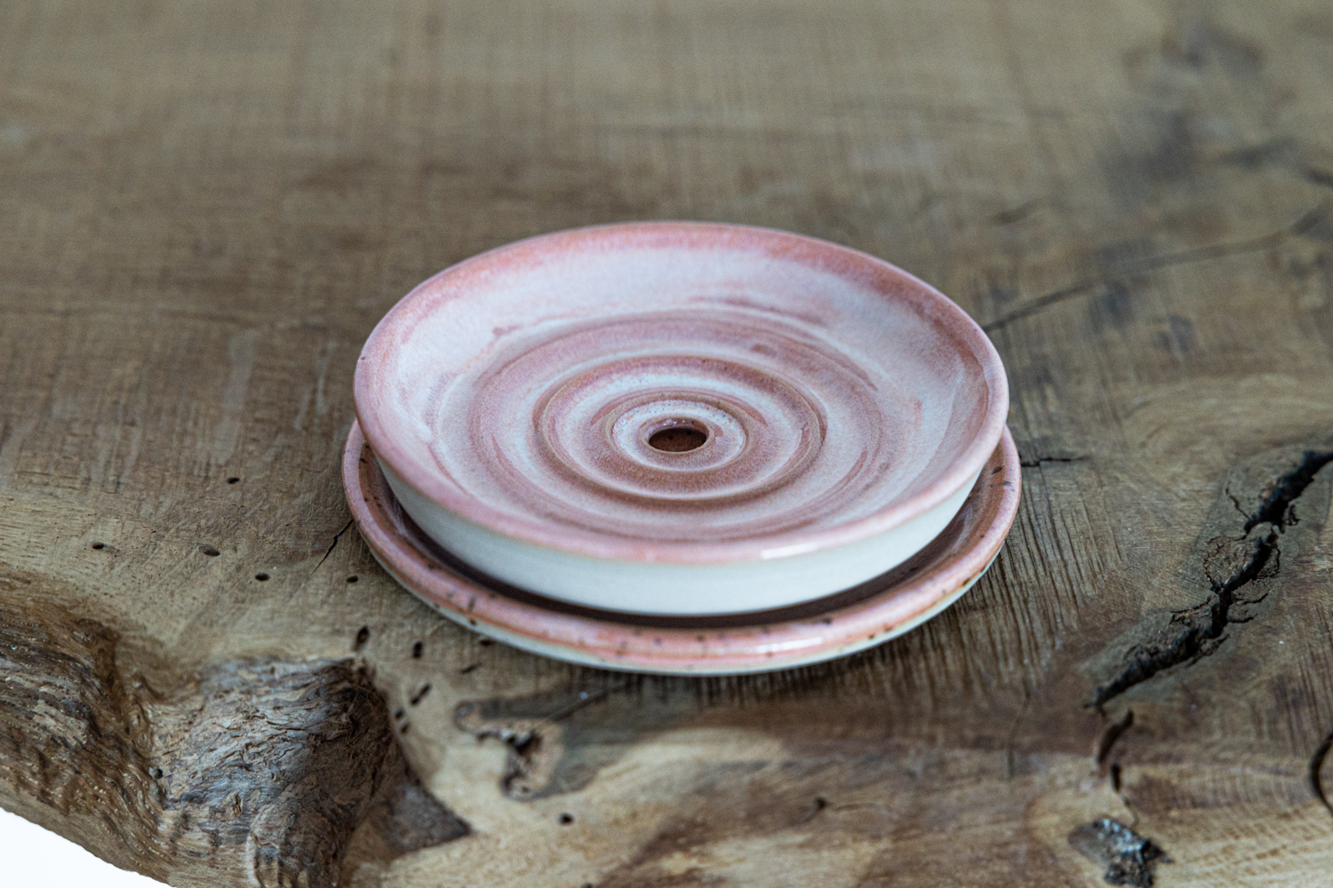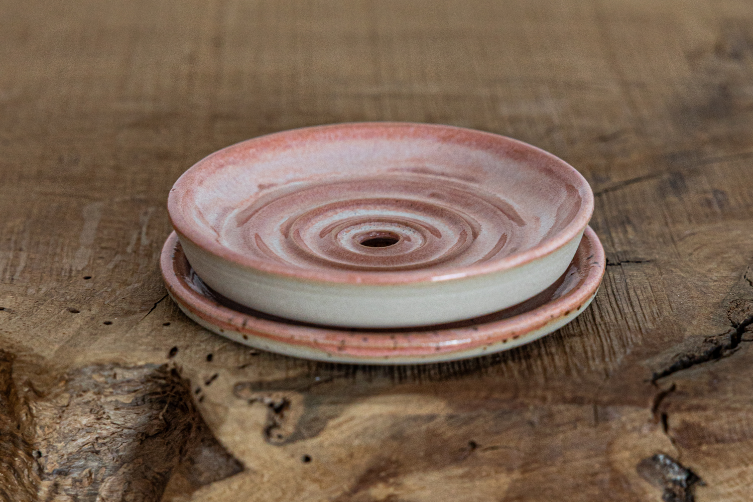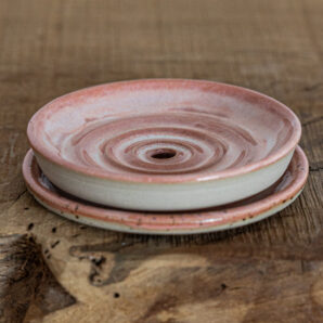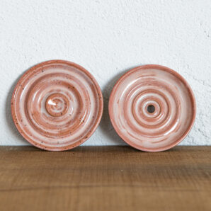 Seifenschale mit Untertasse – mit einer pfirsich-weißen Glasur.